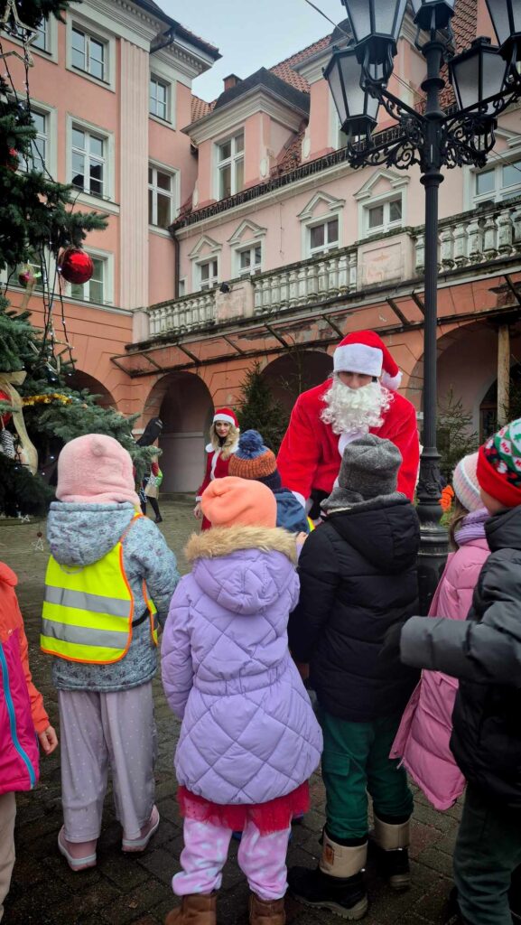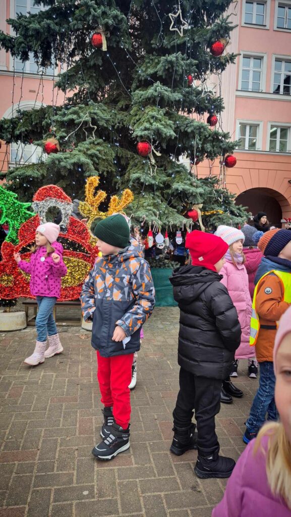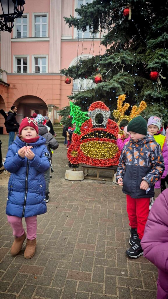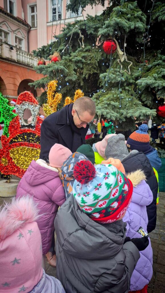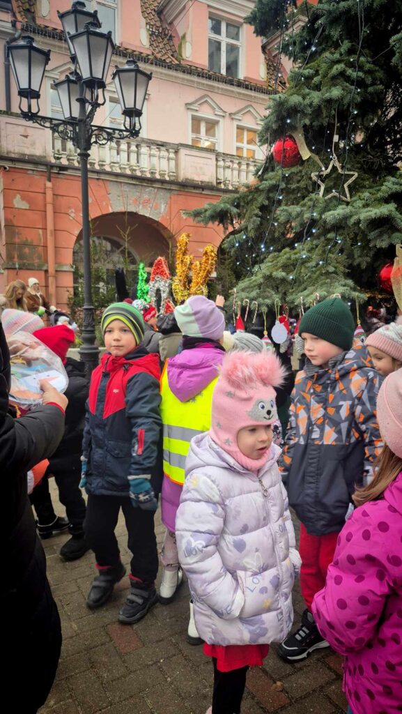 Pod ratuszem w Iławie zapanował wyjątkowy, świąteczny nastrój. Puchatki z naszego przedszkola z ogromnym zaangażowaniem stroiły wielką choinkę, która już z daleka przyciągała wzrok kolorowymi bombkami i błyszczącymi światełkami. Dzieci z radością zawieszały własnoręcznie przygotowane ozdoby, a każda z nich dodawała drzewku jeszcze więcej magii.W powietrzu unosiły się melodie świątecznych piosenek. Pan Burmistrz Iławy Dawid Kopaczewski przywitał nas bardzo ciepło, doceniając dziecięcą energię i trud włożony w przygotowanie dekoracji. Z uśmiechem częstował dzieci cukierkami, co wywołało mnóstwo radości.Po udekorowaniu choinki przyszła pora na pamiątkowe zdjęcia. Chłopcy z naszej grupy mieli okazję udzielić także wywiadu dla KLIK Iława dla Was. Dzieci chętnie pozowały, dumne ze swojego dzieła i zadowolone z tak miło spędzonego czasu. To był naprawdę wyjątkowy, pełen ciepła i świątecznego ducha dzień, który na długo pozostanie w naszej pamięci.