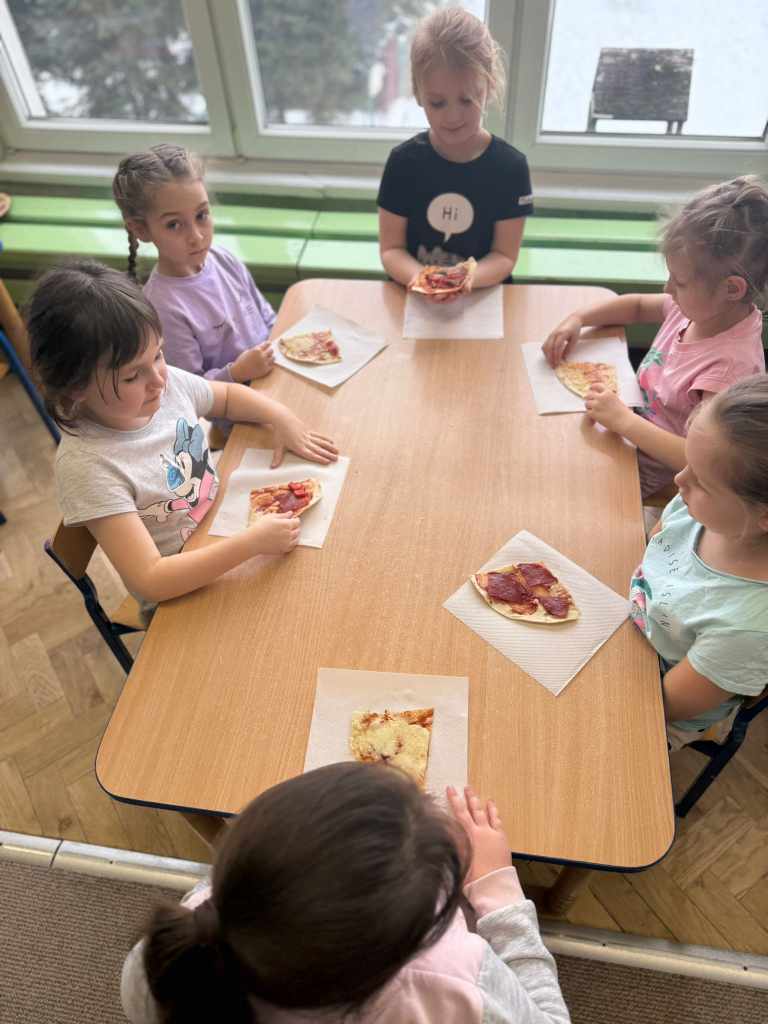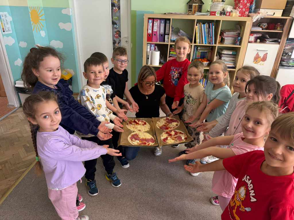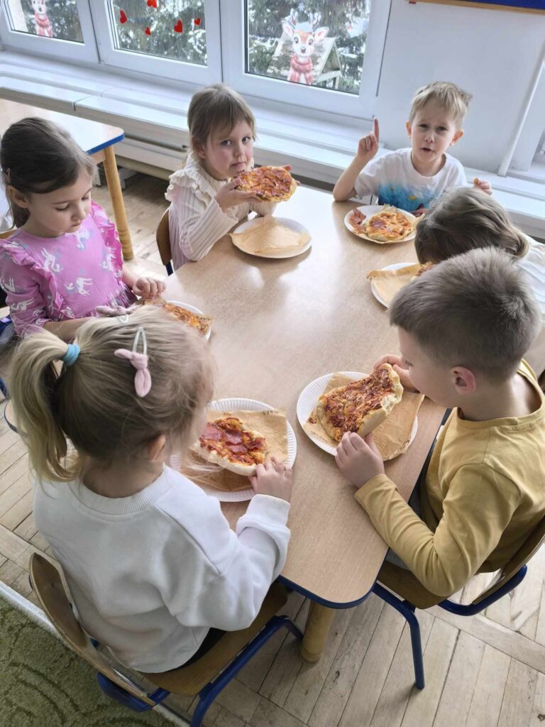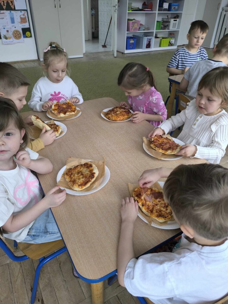 Dziś w naszym przedszkolu obchodziliśmy pyszny Dzień Pizzy!Grupa Króliczki poznała przepis oraz składniki potrzebne do przygotowania pizzy. Dzieci samodzielnie wykonały ciasto według przepisu, formowały je i układały na nim swoje ulubione dodatki. Następnie z wielkim apetytem zajadały własnoręcznie przygotowane wypieki.Najmłodsze Kangurki także poznały to wyjątkowe święto i z radością wykonały tematyczne karty pracy.Sówki z zaangażowaniem przygotowywały pizzę – dzieci kroiły składniki i pomagały w jej komponowaniu. W całym przedszkolu unosił się wspaniały, apetyczny zapach, a pizza była przepyszna!To był dzień pełen radości, zapachów i kulinarnych doświadczeń 🍕