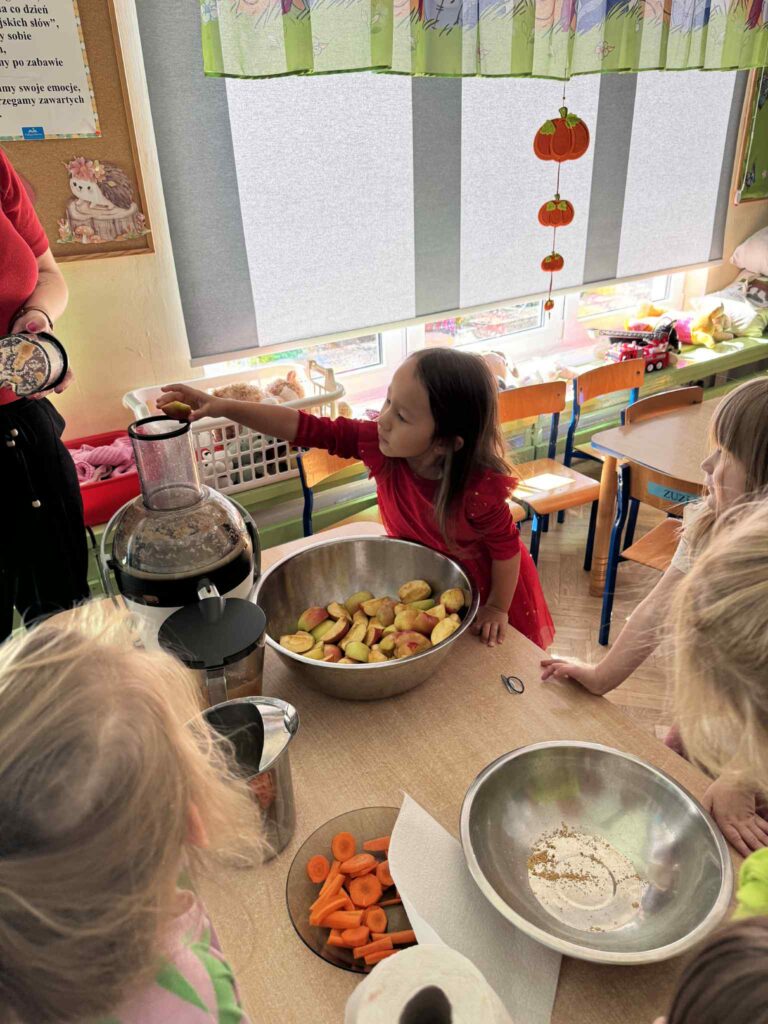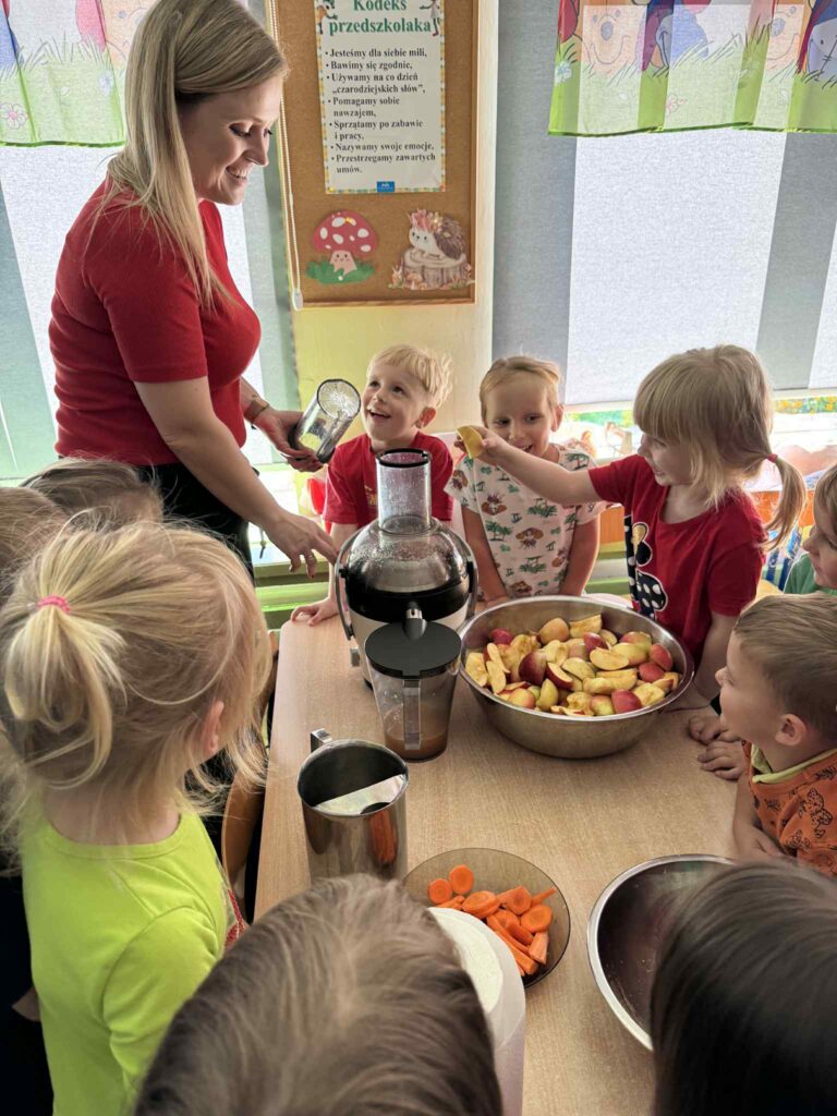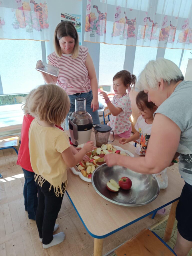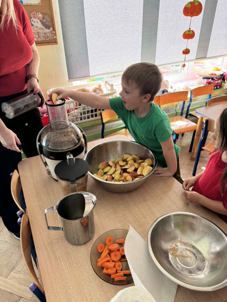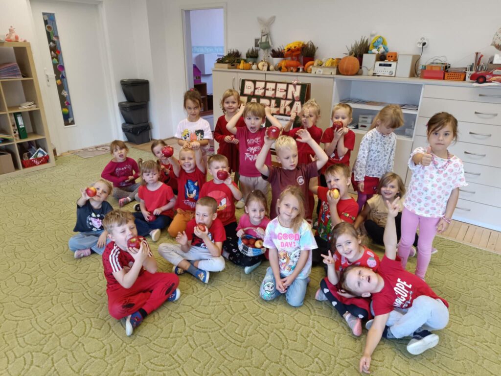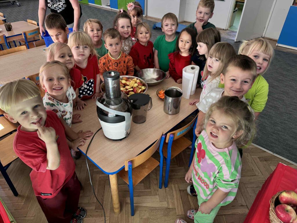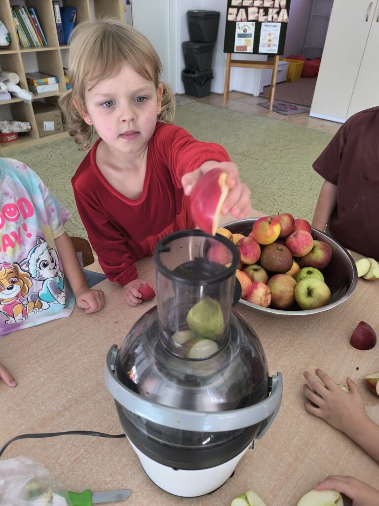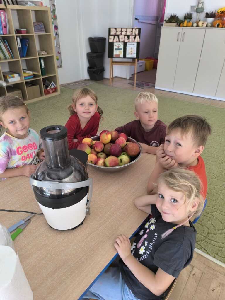 Dziś grupy Sówki, Króliczki i Tygryski świętowały Dzień Jabłka! 🍎Z tej okazji dzieci brały udział w różnorodnych zabawach plastycznych i ruchowych, poznając przy tym walory zdrowotne jabłek. Nie zabrakło także wspólnego przygotowywania pysznych, świeżo wyciskanych soków jabłkowych – było zdrowo, smacznie i bardzo wesoło!
