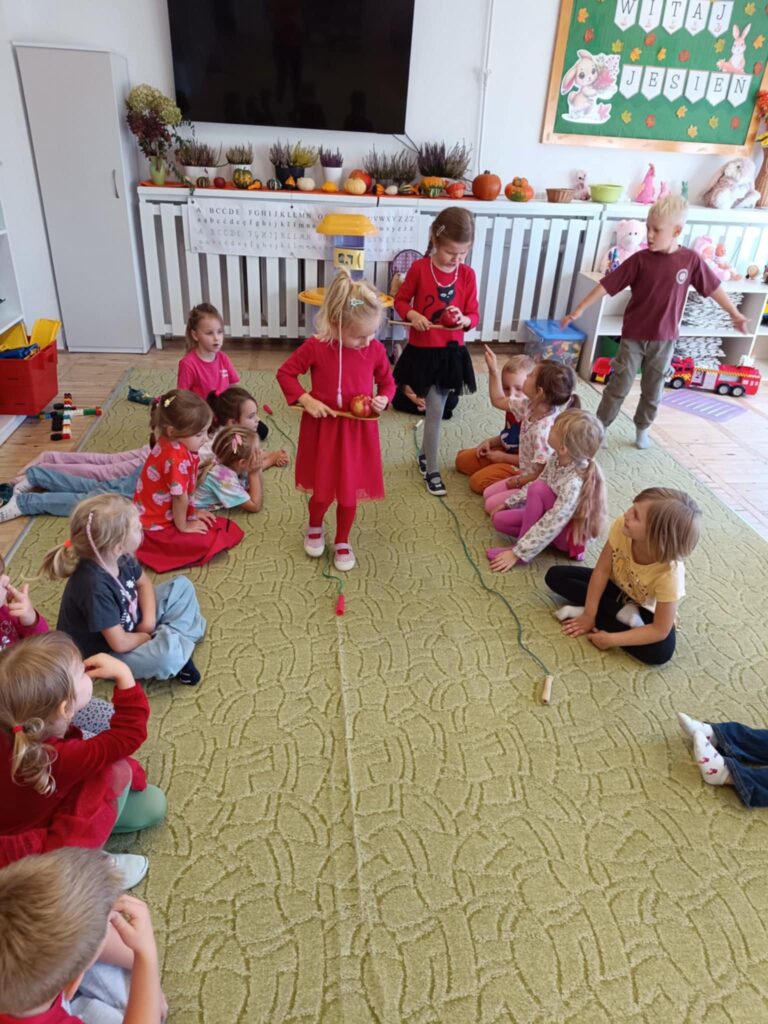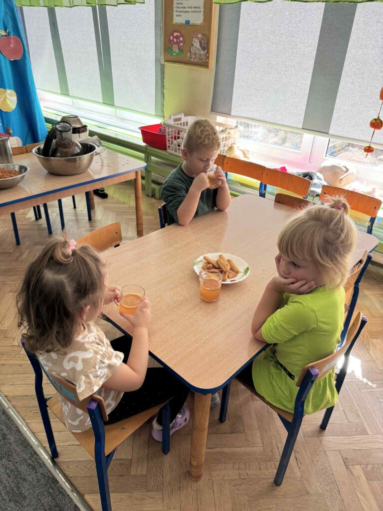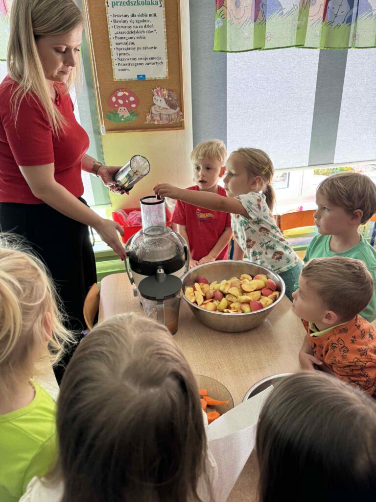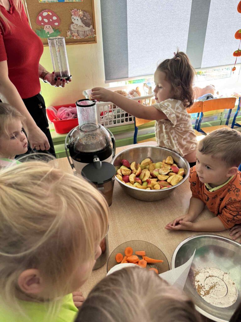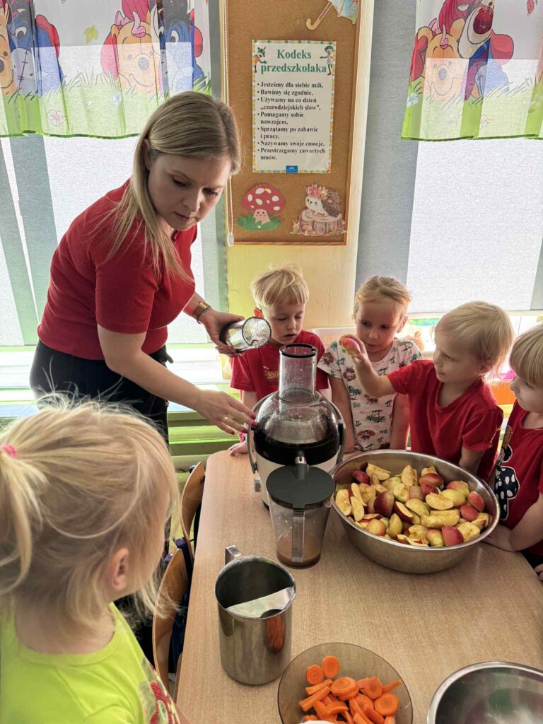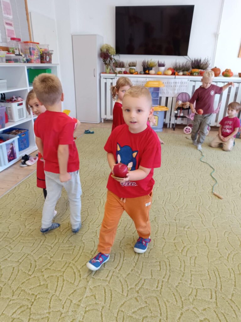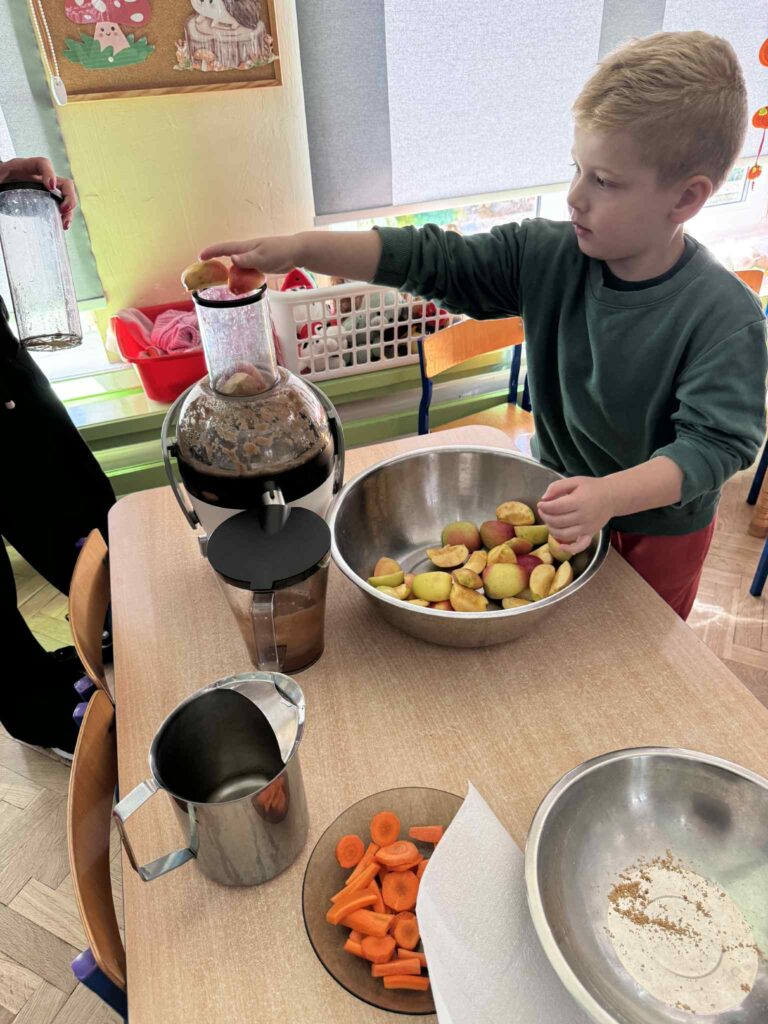 Dziś grupy Sówki, Króliczki i Tygryski świętowały Dzień Jabłka! 🍎Z tej okazji dzieci brały udział w różnorodnych zabawach plastycznych i ruchowych, poznając przy tym walory zdrowotne jabłek. Nie zabrakło także wspólnego przygotowywania pysznych, świeżo wyciskanych soków jabłkowych – było zdrowo, smacznie i bardzo wesoło!