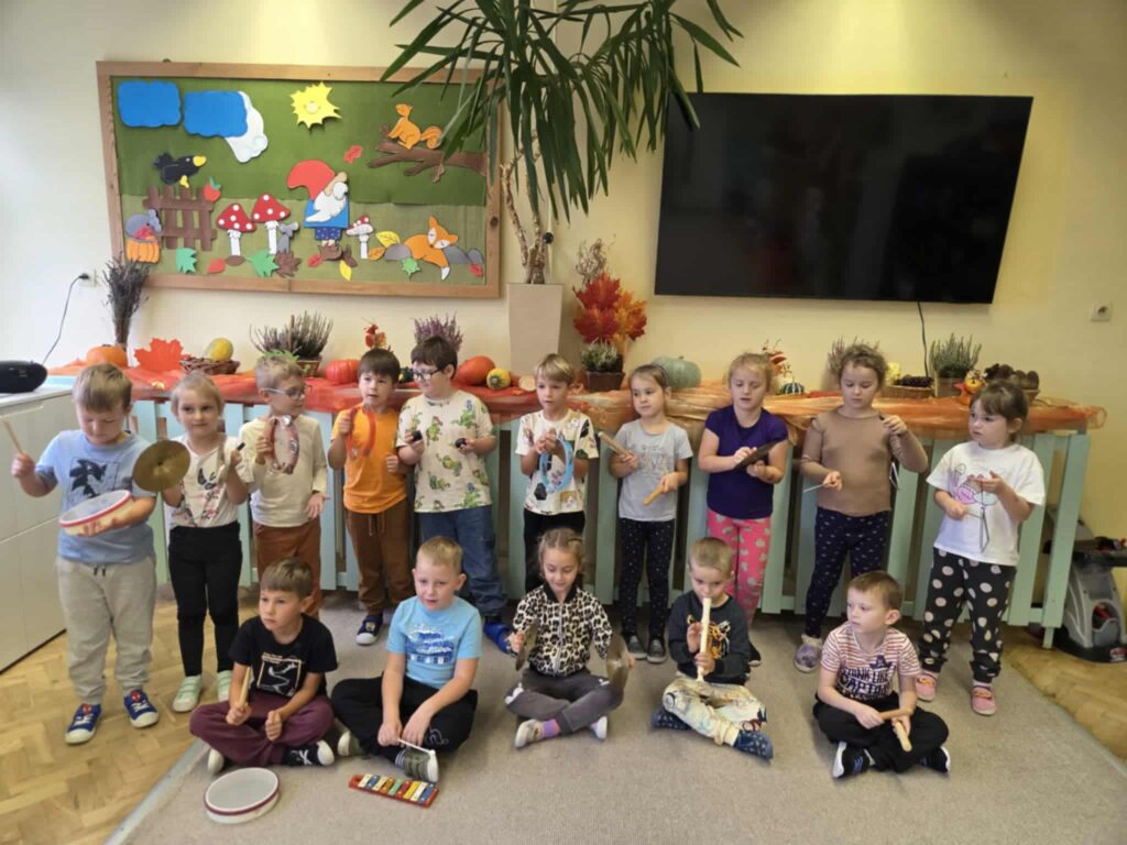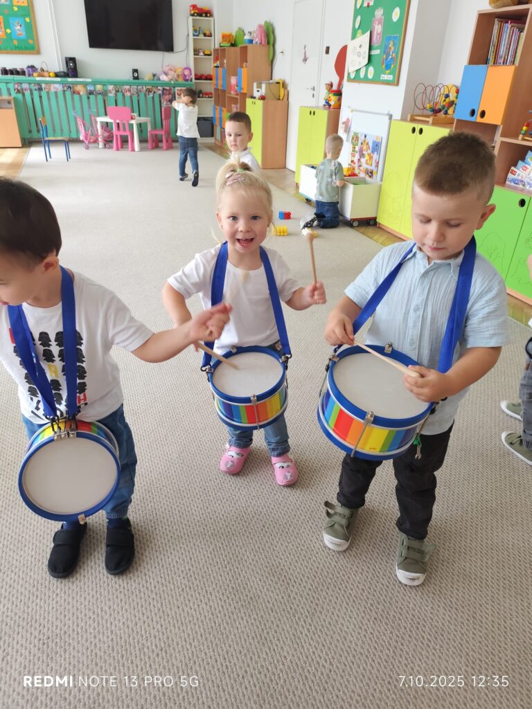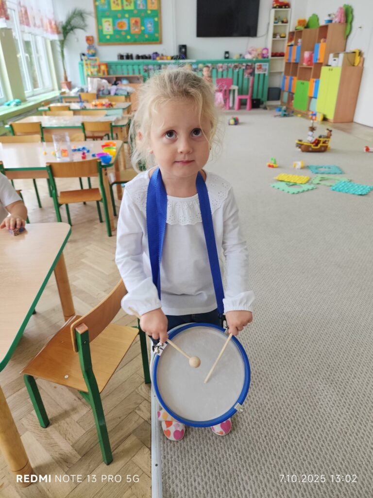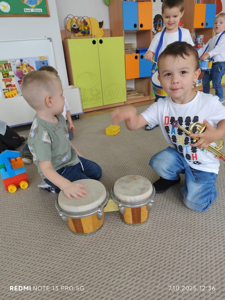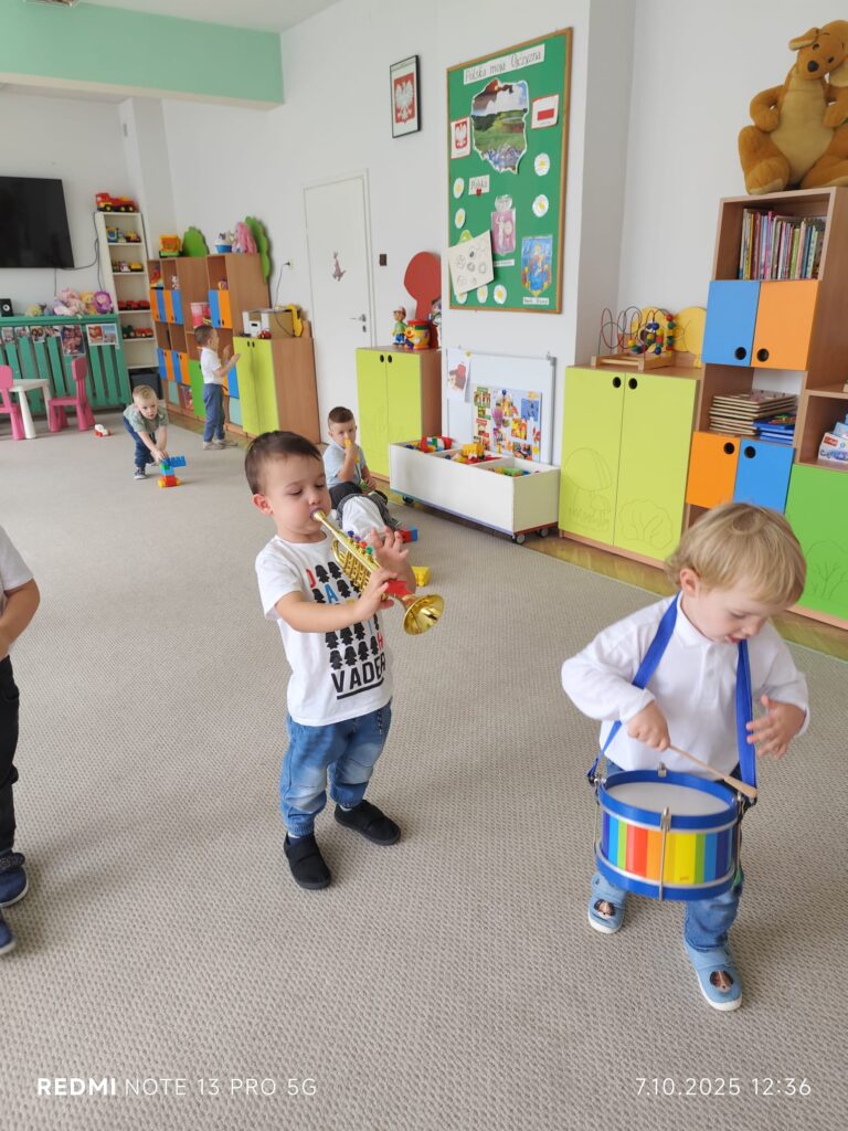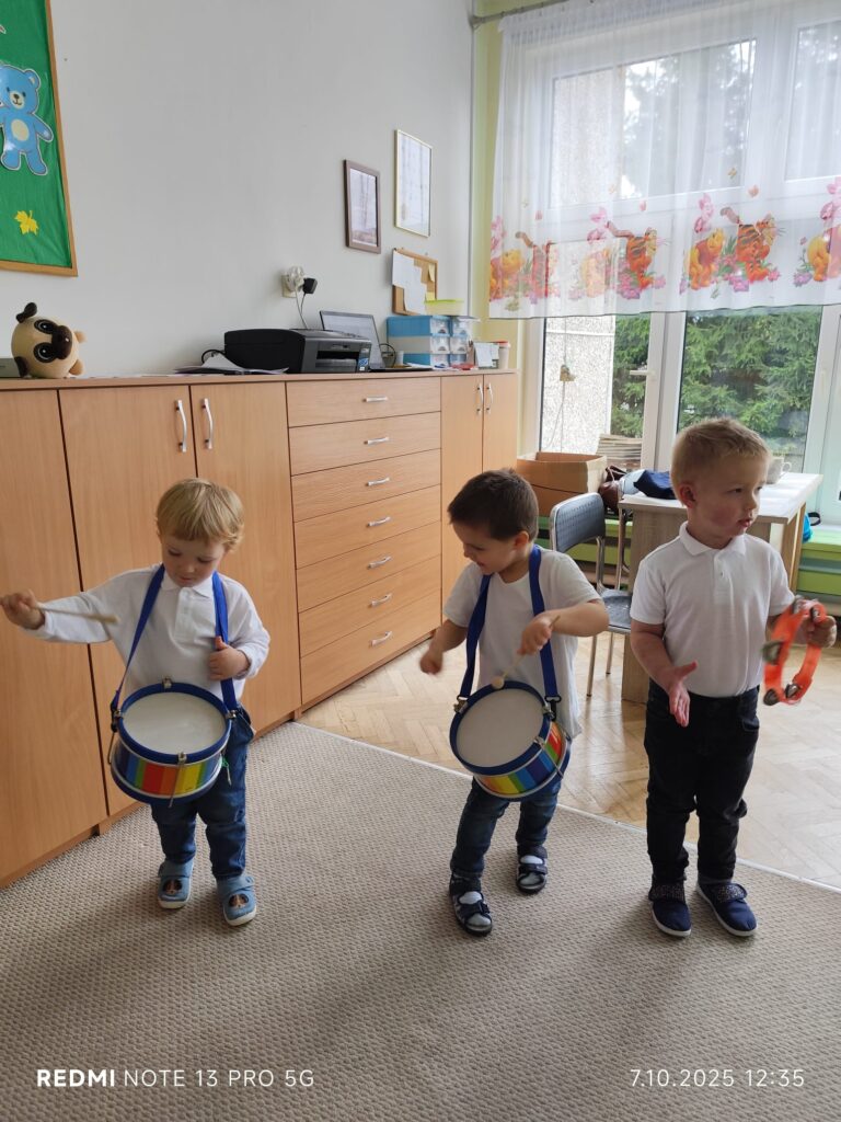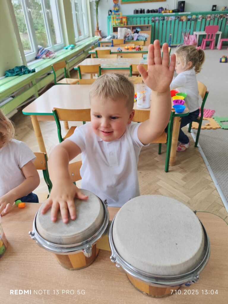 Z okazji Dnia Muzyki dzieci ze wszystkich grup wzięły udział w radosnych, muzycznych zajęciach. Przedszkolaki utrwalały nazwy instrumentów, tworzyły własne instrumenty z materiałów recyklingowych — m.in. z pudełek po jogurtach — oraz wspólnie grały, śpiewały i tańczyły. Było głośno, kreatywnie i bardzo wesoło! Ten dzień dostarczył wszystkim mnóstwo muzycznej radości i inspiracji.