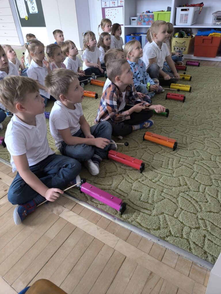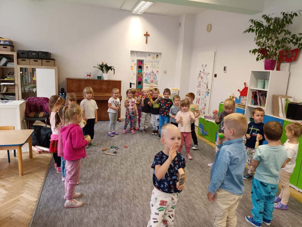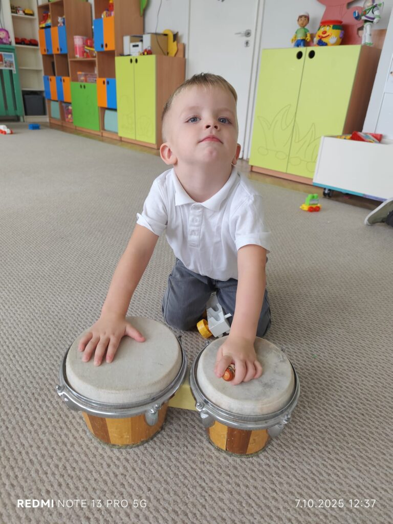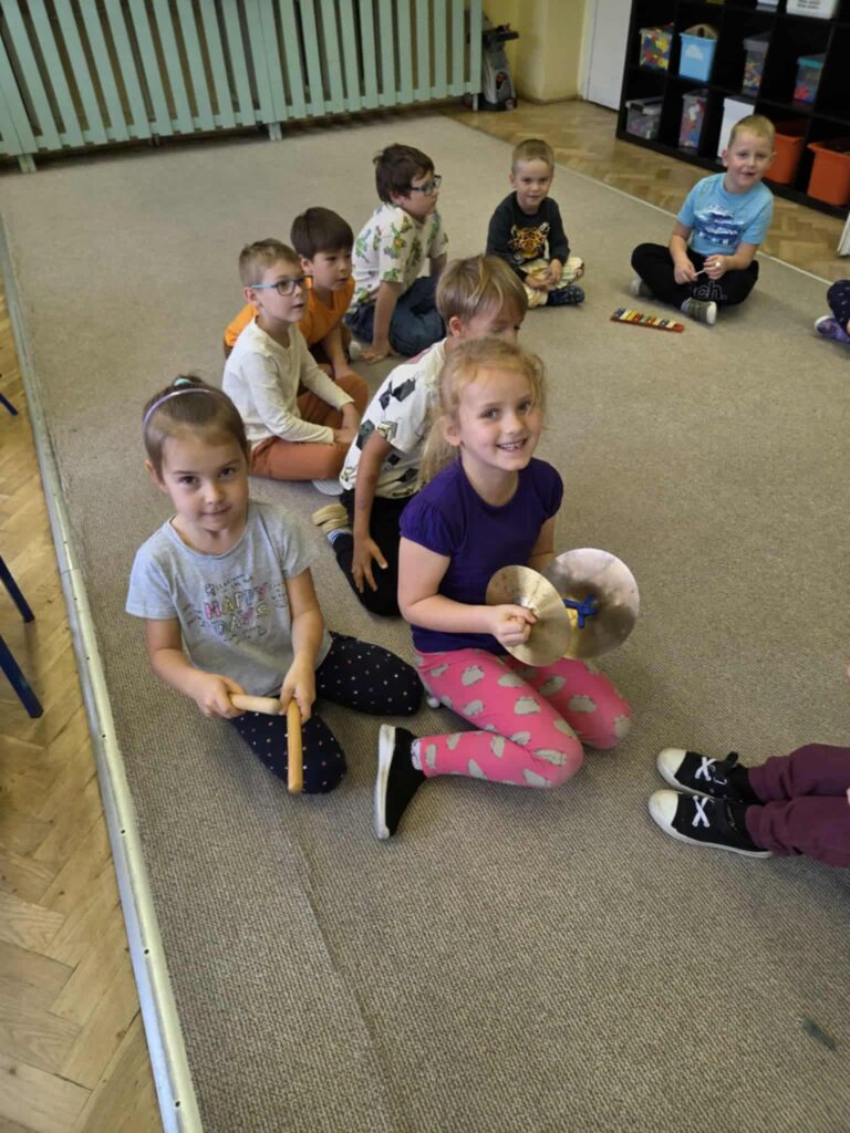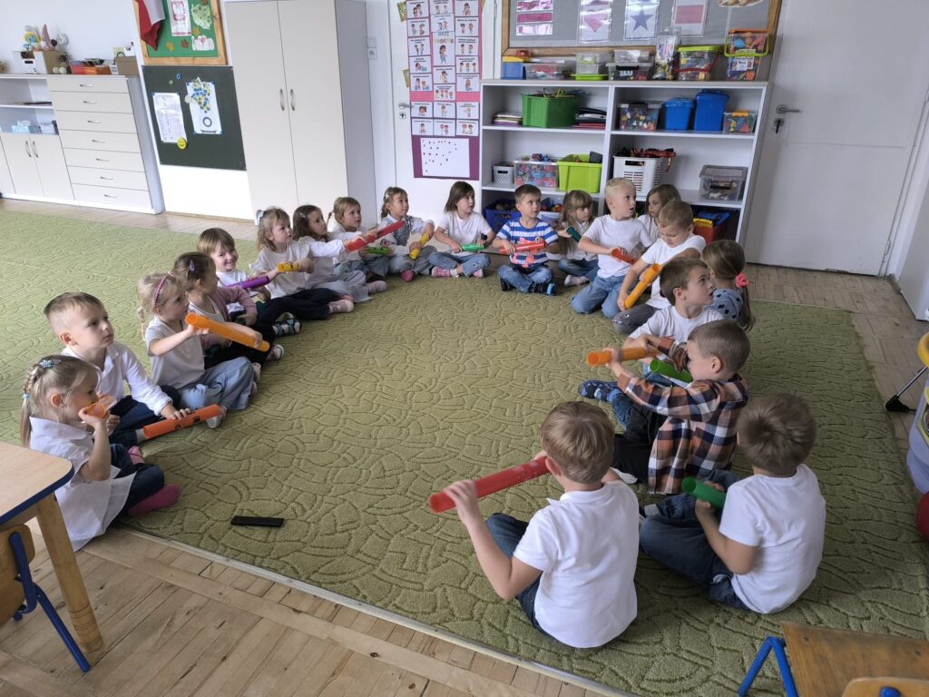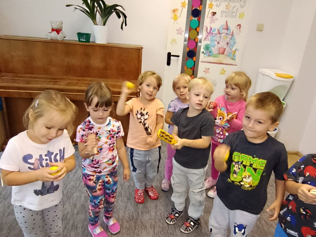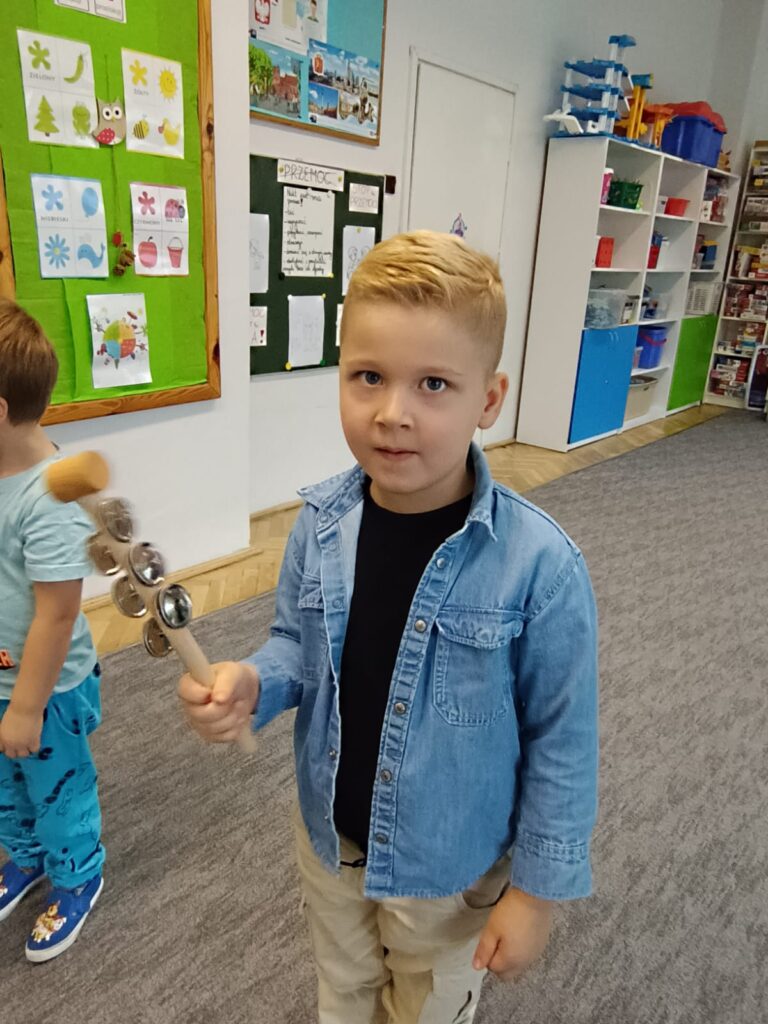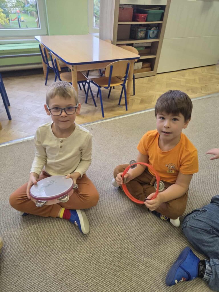 Z okazji Dnia Muzyki dzieci ze wszystkich grup wzięły udział w radosnych, muzycznych zajęciach. Przedszkolaki utrwalały nazwy instrumentów, tworzyły własne instrumenty z materiałów recyklingowych — m.in. z pudełek po jogurtach — oraz wspólnie grały, śpiewały i tańczyły. Było głośno, kreatywnie i bardzo wesoło! Ten dzień dostarczył wszystkim mnóstwo muzycznej radości i inspiracji.