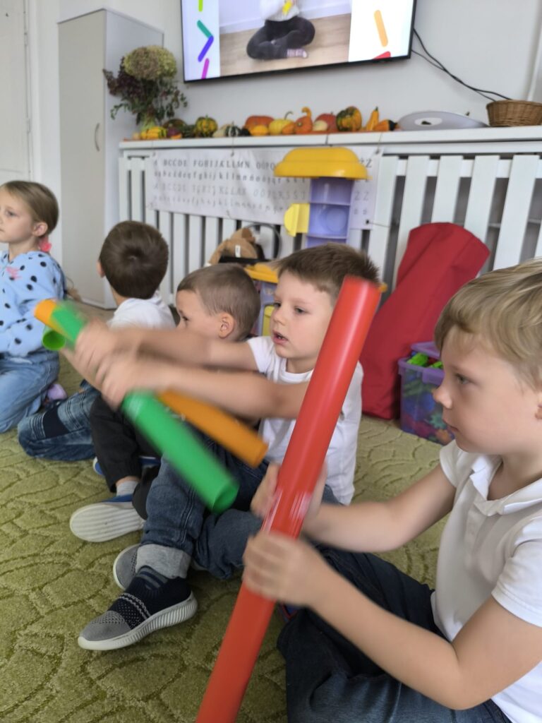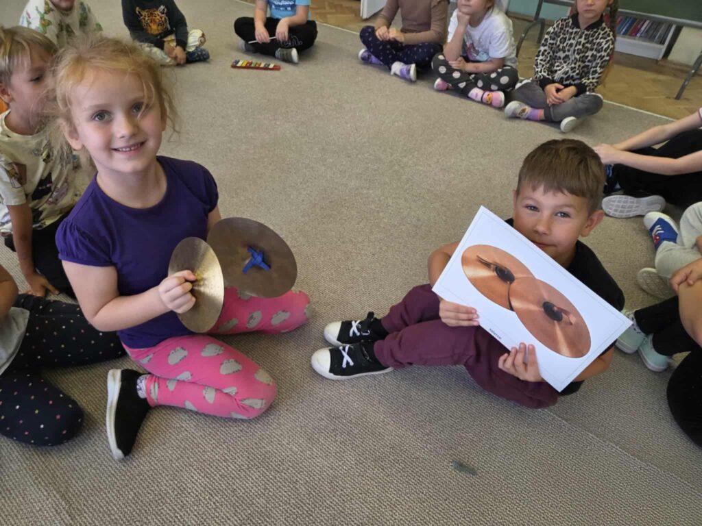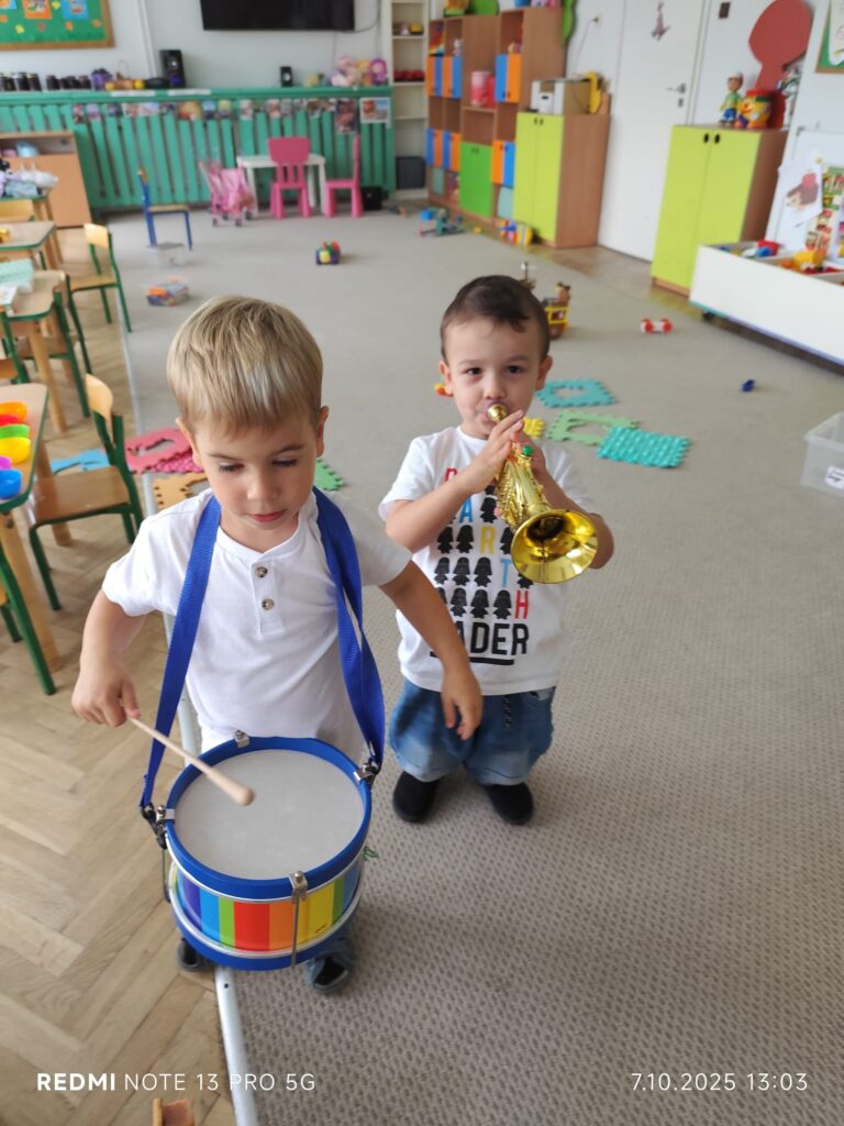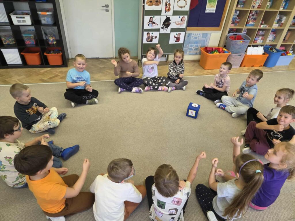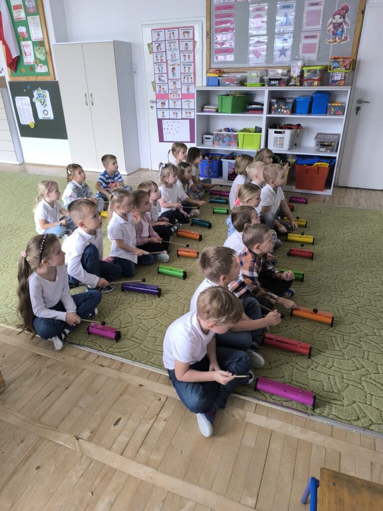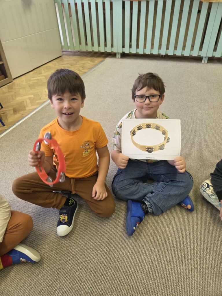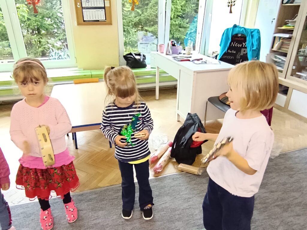 Z okazji Dnia Muzyki dzieci ze wszystkich grup wzięły udział w radosnych, muzycznych zajęciach. Przedszkolaki utrwalały nazwy instrumentów, tworzyły własne instrumenty z materiałów recyklingowych — m.in. z pudełek po jogurtach — oraz wspólnie grały, śpiewały i tańczyły. Było głośno, kreatywnie i bardzo wesoło! Ten dzień dostarczył wszystkim mnóstwo muzycznej radości i inspiracji.