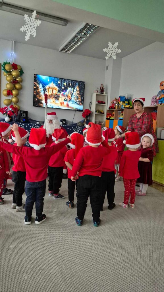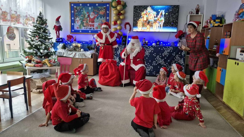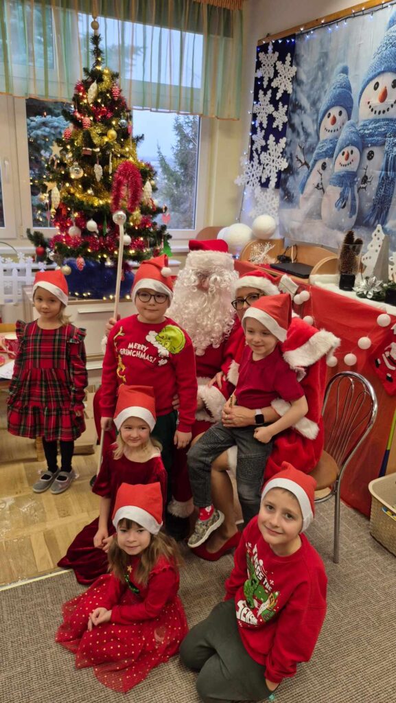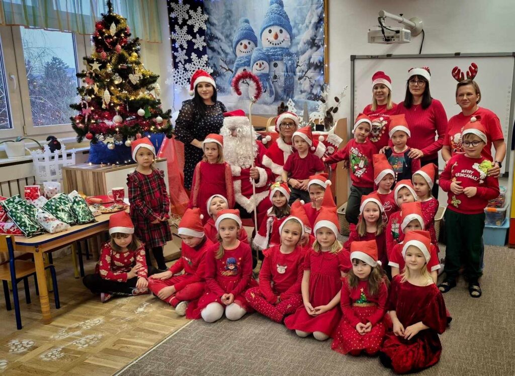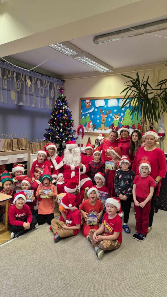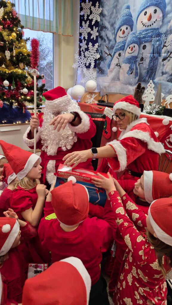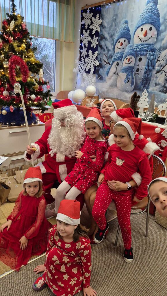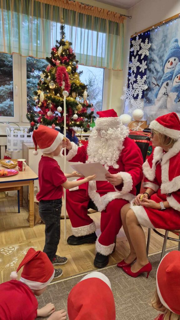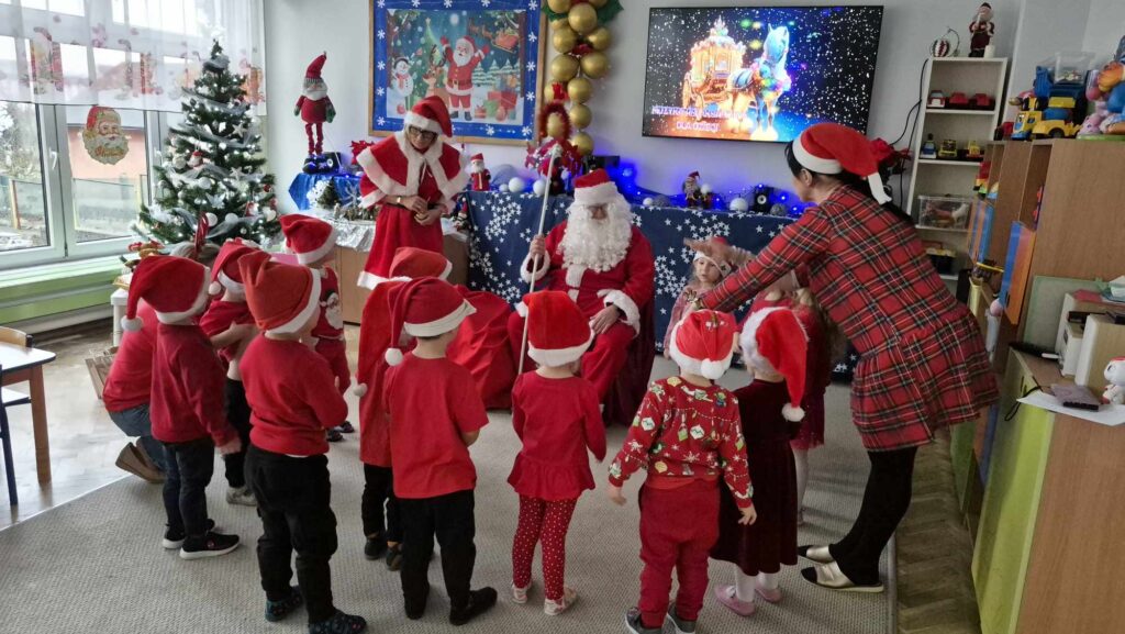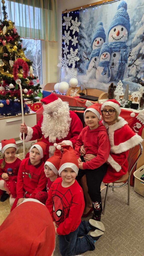 Dziś w naszym przedszkolu wydarzyła się niezwykła, długo wyczekiwana chwila — odwiedził nas sam Święty Mikołaj wraz ze swoją żoną, Mikołajową. Już od rana w powietrzu czuć było świąteczną atmosferę, a dzieci z niecierpliwością wypatrywały wyjątkowych gości.Gdy Mikołaj pojawił się w sali, na twarzach przedszkolaków od razu pojawiły się szerokie uśmiechy. Dzieci powitały go radosnymi piosenkami i krótkimi wierszykami, które przygotowywały od kilku dni. Mikołajowa z czułością obserwowała występy i pomagała w rozdawaniu upominków.Każde dziecko otrzymało drobny prezent oraz miało okazję porozmawiać z Mikołajem, który cierpliwie wysłuchał wszystkich świątecznych marzeń i życzeń. Atmosfera była pełna radości, śmiechu i ciepła.Wizyta Świętego Mikołaja była dla dzieci ogromnym przeżyciem i na długo zostanie w ich pamięci. Dziękujemy Mikołajowi i Mikołajowej za wspólnie spędzony czas, a dzieciom za piękne występy i uśmiechy, które tworzą prawdziwą magię świąt!