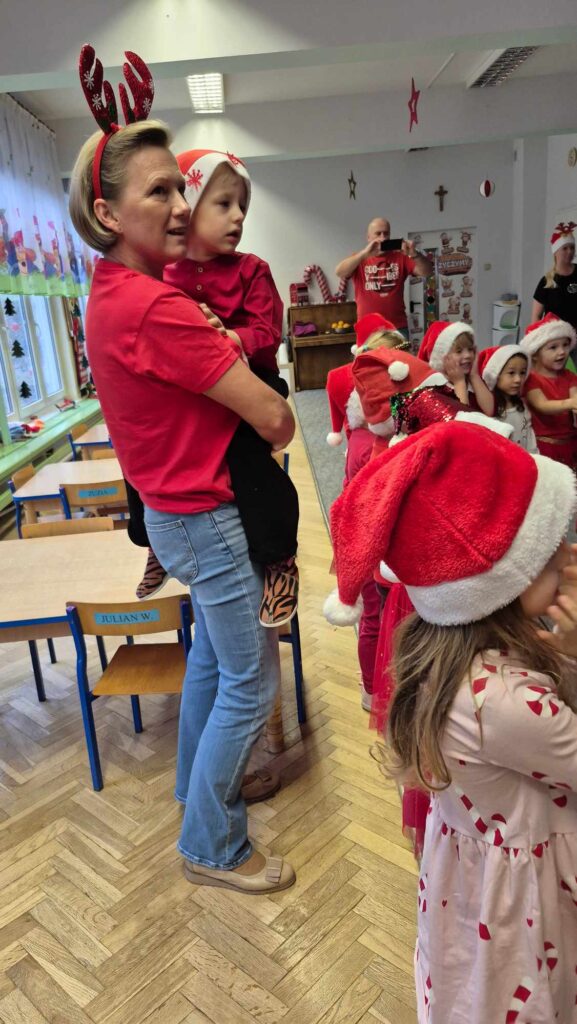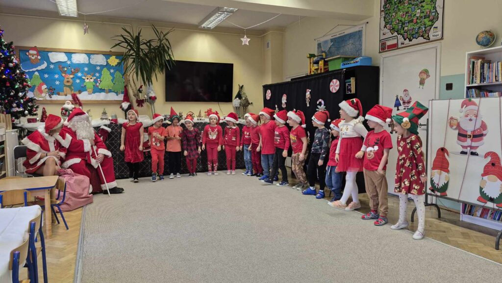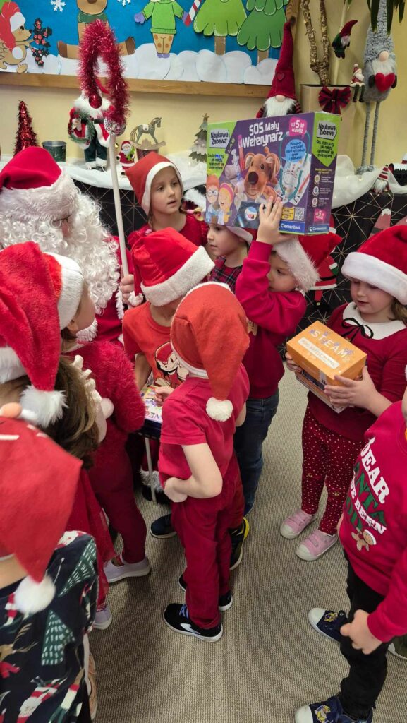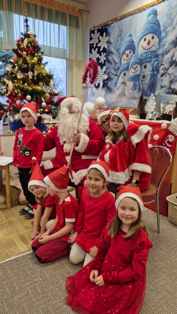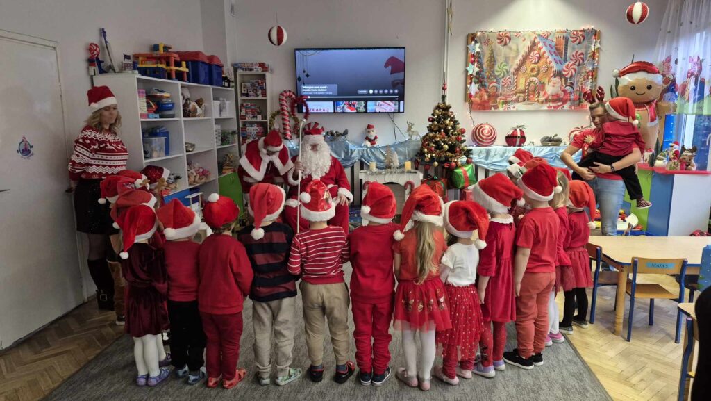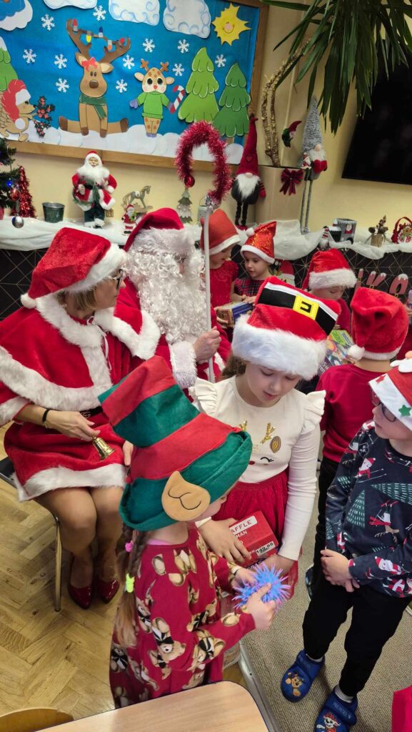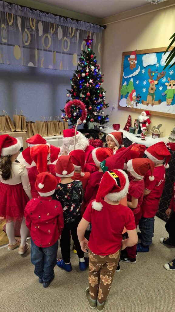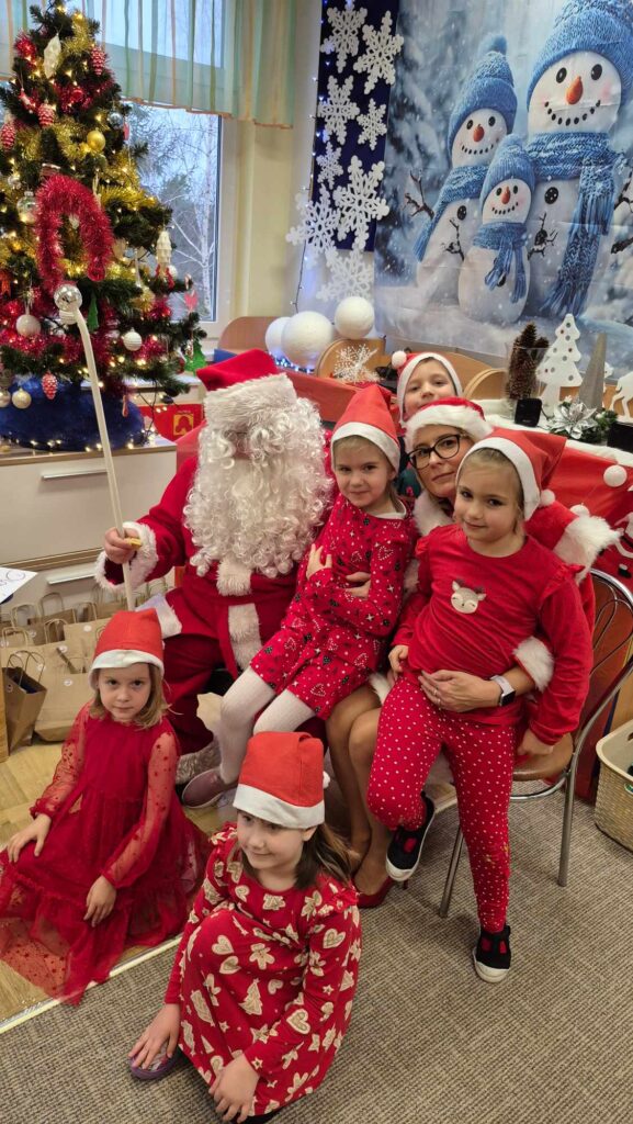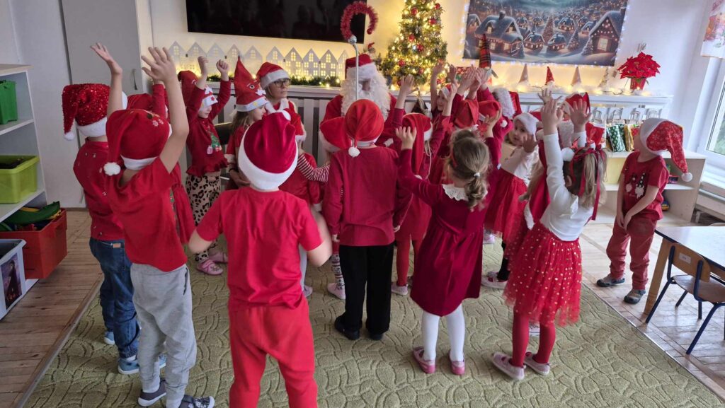 Dziś w naszym przedszkolu wydarzyła się niezwykła, długo wyczekiwana chwila — odwiedził nas sam Święty Mikołaj wraz ze swoją żoną, Mikołajową. Już od rana w powietrzu czuć było świąteczną atmosferę, a dzieci z niecierpliwością wypatrywały wyjątkowych gości.Gdy Mikołaj pojawił się w sali, na twarzach przedszkolaków od razu pojawiły się szerokie uśmiechy. Dzieci powitały go radosnymi piosenkami i krótkimi wierszykami, które przygotowywały od kilku dni. Mikołajowa z czułością obserwowała występy i pomagała w rozdawaniu upominków.Każde dziecko otrzymało drobny prezent oraz miało okazję porozmawiać z Mikołajem, który cierpliwie wysłuchał wszystkich świątecznych marzeń i życzeń. Atmosfera była pełna radości, śmiechu i ciepła.Wizyta Świętego Mikołaja była dla dzieci ogromnym przeżyciem i na długo zostanie w ich pamięci. Dziękujemy Mikołajowi i Mikołajowej za wspólnie spędzony czas, a dzieciom za piękne występy i uśmiechy, które tworzą prawdziwą magię świąt!