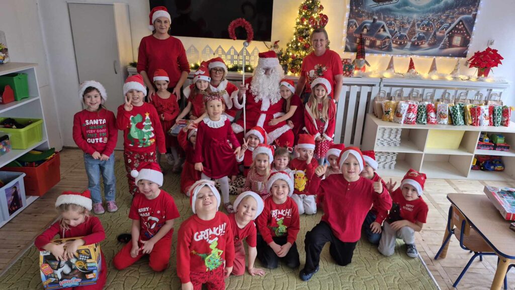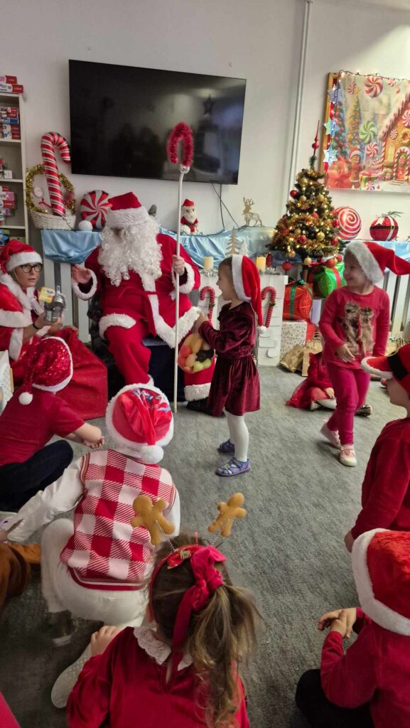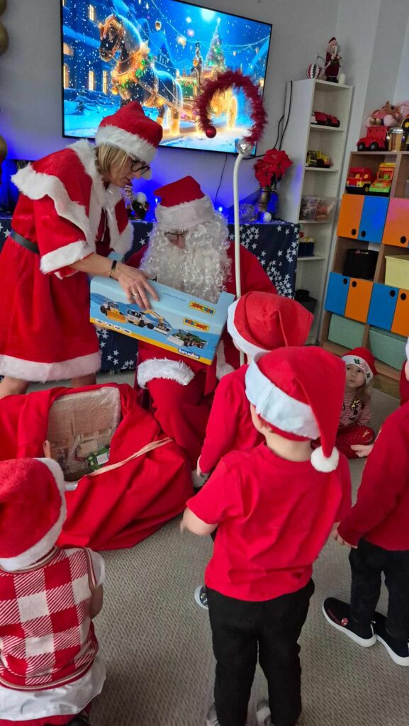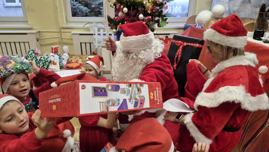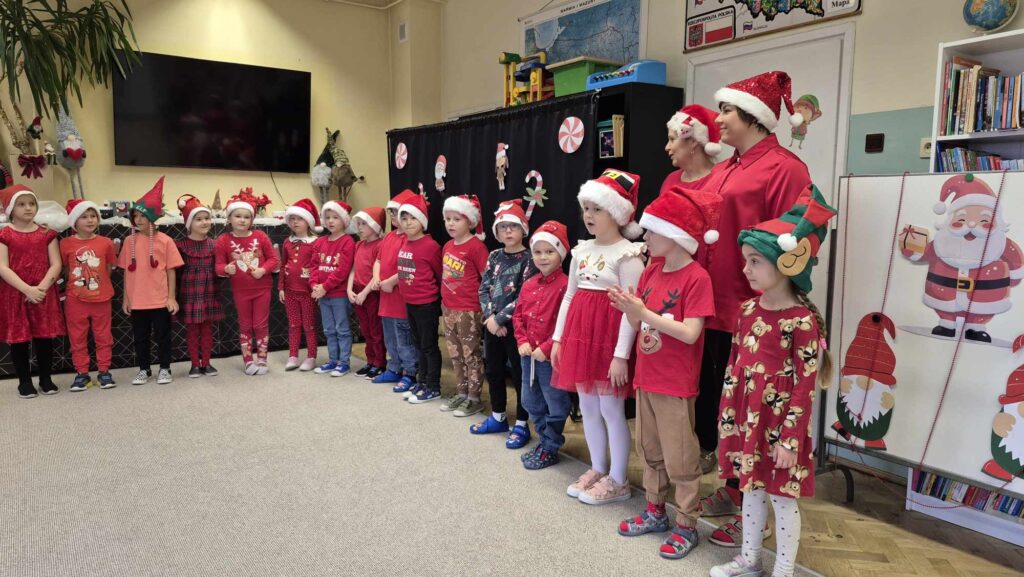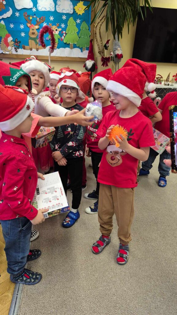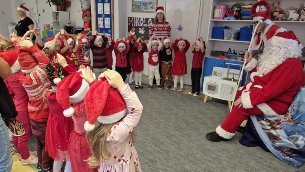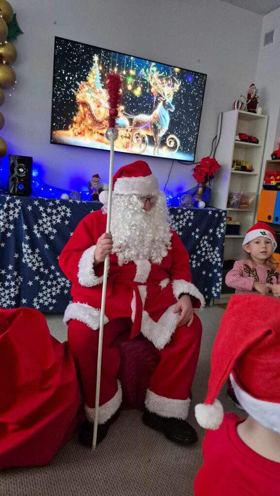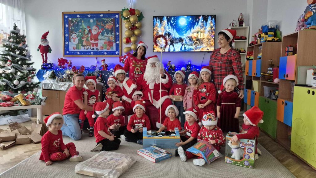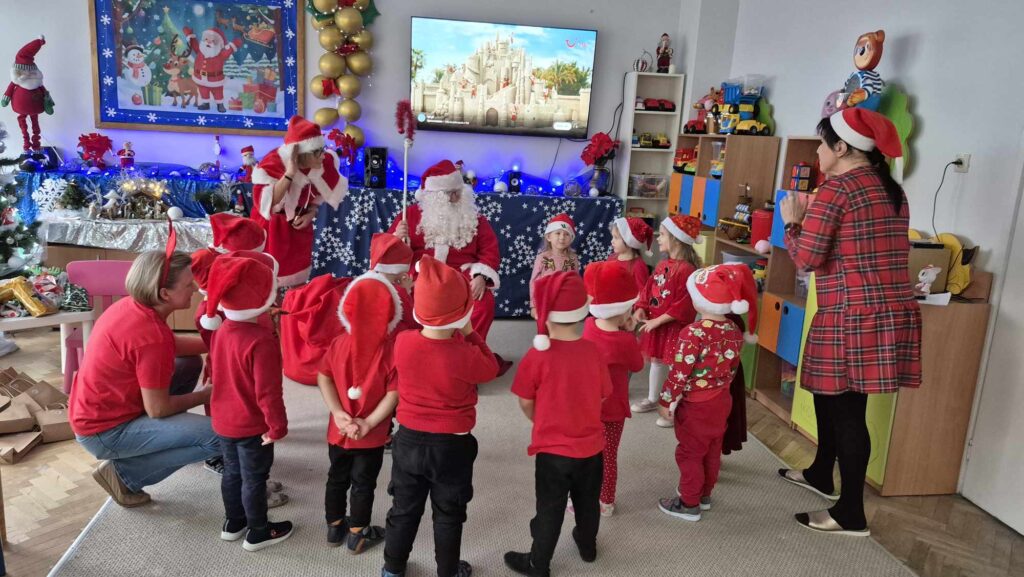 Dziś w naszym przedszkolu wydarzyła się niezwykła, długo wyczekiwana chwila — odwiedził nas sam Święty Mikołaj wraz ze swoją żoną, Mikołajową. Już od rana w powietrzu czuć było świąteczną atmosferę, a dzieci z niecierpliwością wypatrywały wyjątkowych gości.Gdy Mikołaj pojawił się w sali, na twarzach przedszkolaków od razu pojawiły się szerokie uśmiechy. Dzieci powitały go radosnymi piosenkami i krótkimi wierszykami, które przygotowywały od kilku dni. Mikołajowa z czułością obserwowała występy i pomagała w rozdawaniu upominków.Każde dziecko otrzymało drobny prezent oraz miało okazję porozmawiać z Mikołajem, który cierpliwie wysłuchał wszystkich świątecznych marzeń i życzeń. Atmosfera była pełna radości, śmiechu i ciepła.Wizyta Świętego Mikołaja była dla dzieci ogromnym przeżyciem i na długo zostanie w ich pamięci. Dziękujemy Mikołajowi i Mikołajowej za wspólnie spędzony czas, a dzieciom za piękne występy i uśmiechy, które tworzą prawdziwą magię świąt!