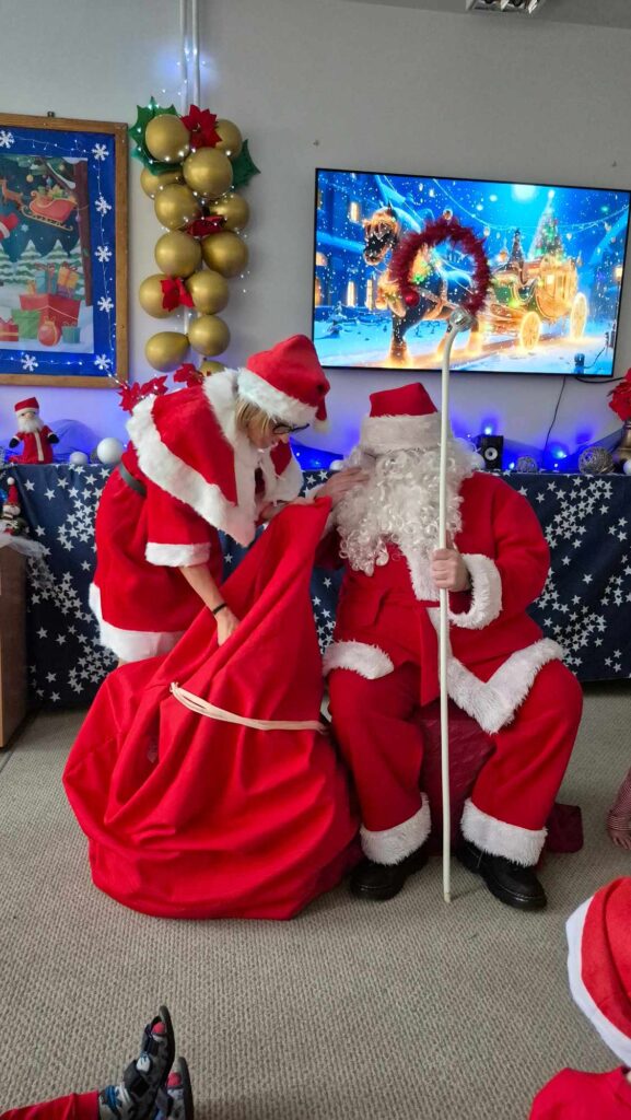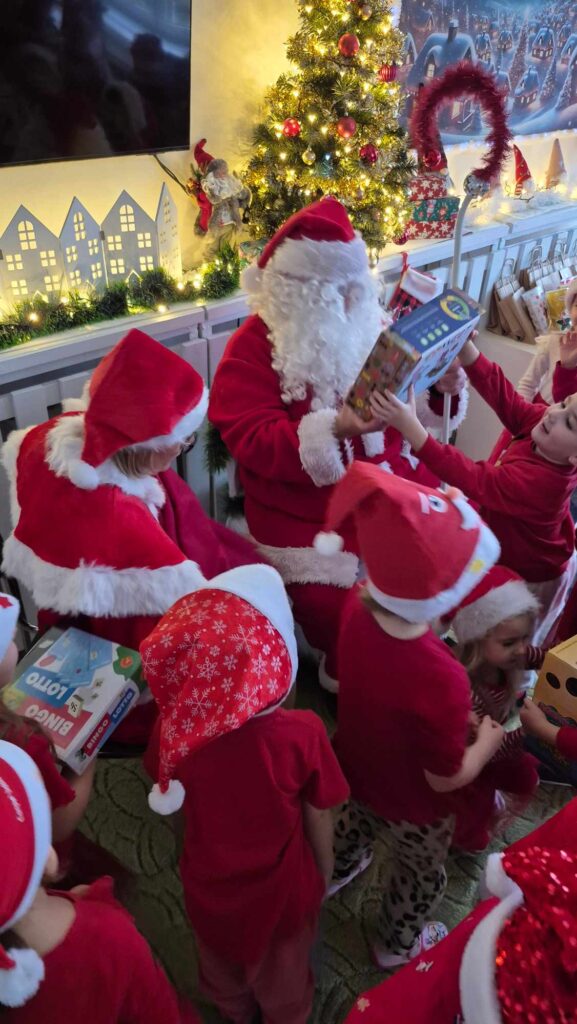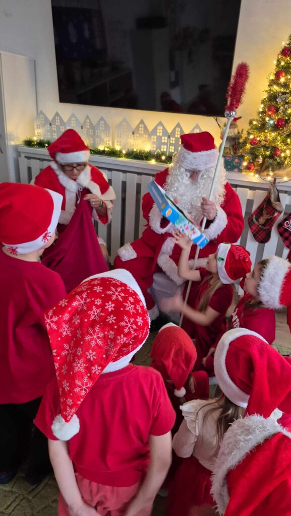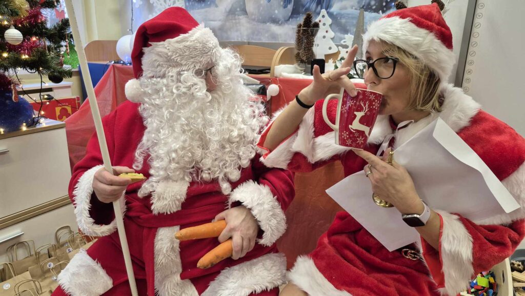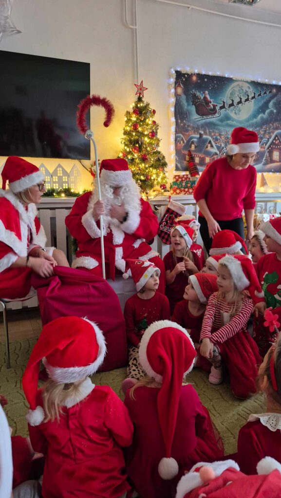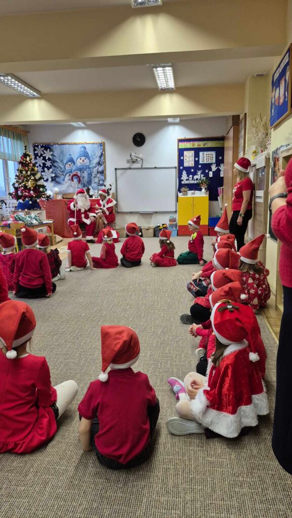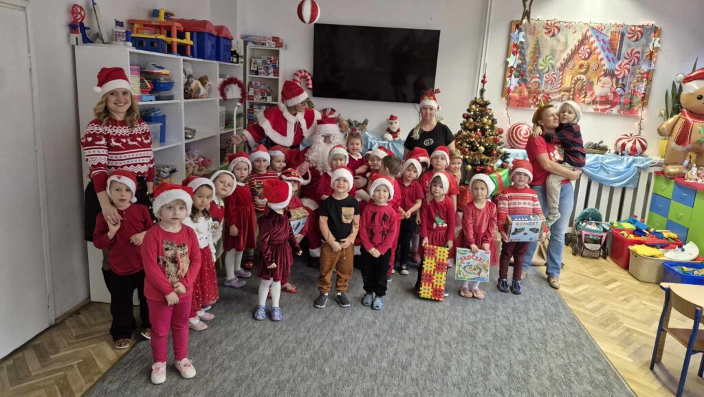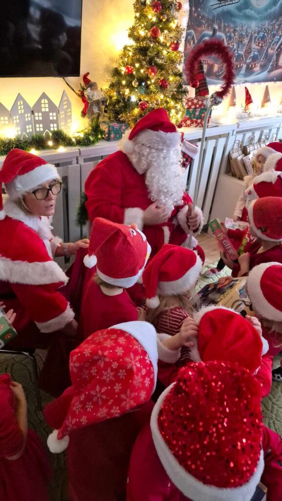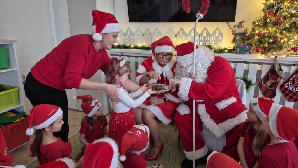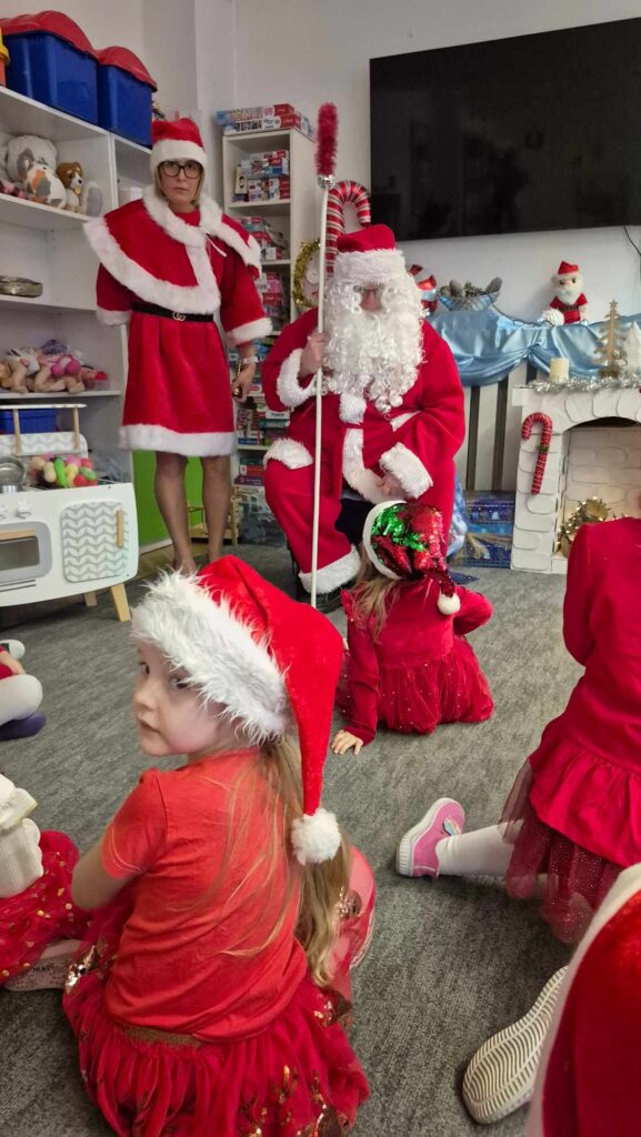 Dziś w naszym przedszkolu wydarzyła się niezwykła, długo wyczekiwana chwila — odwiedził nas sam Święty Mikołaj wraz ze swoją żoną, Mikołajową. Już od rana w powietrzu czuć było świąteczną atmosferę, a dzieci z niecierpliwością wypatrywały wyjątkowych gości.Gdy Mikołaj pojawił się w sali, na twarzach przedszkolaków od razu pojawiły się szerokie uśmiechy. Dzieci powitały go radosnymi piosenkami i krótkimi wierszykami, które przygotowywały od kilku dni. Mikołajowa z czułością obserwowała występy i pomagała w rozdawaniu upominków.Każde dziecko otrzymało drobny prezent oraz miało okazję porozmawiać z Mikołajem, który cierpliwie wysłuchał wszystkich świątecznych marzeń i życzeń. Atmosfera była pełna radości, śmiechu i ciepła.Wizyta Świętego Mikołaja była dla dzieci ogromnym przeżyciem i na długo zostanie w ich pamięci. Dziękujemy Mikołajowi i Mikołajowej za wspólnie spędzony czas, a dzieciom za piękne występy i uśmiechy, które tworzą prawdziwą magię świąt!