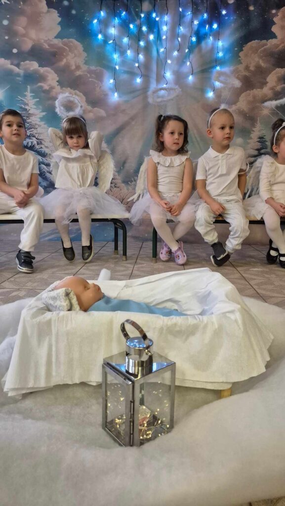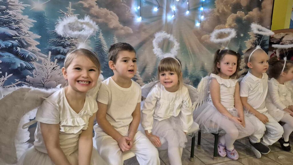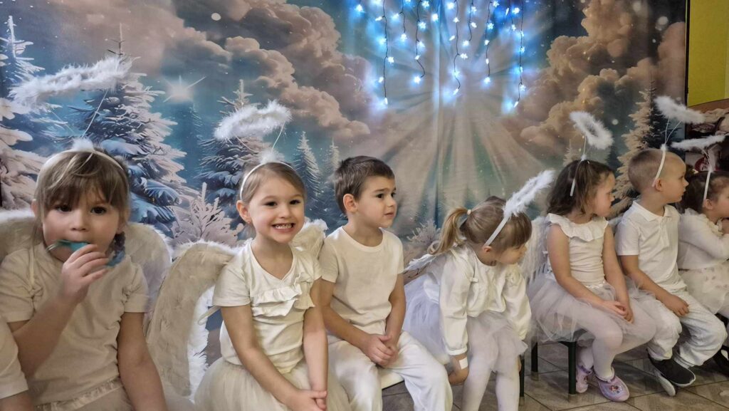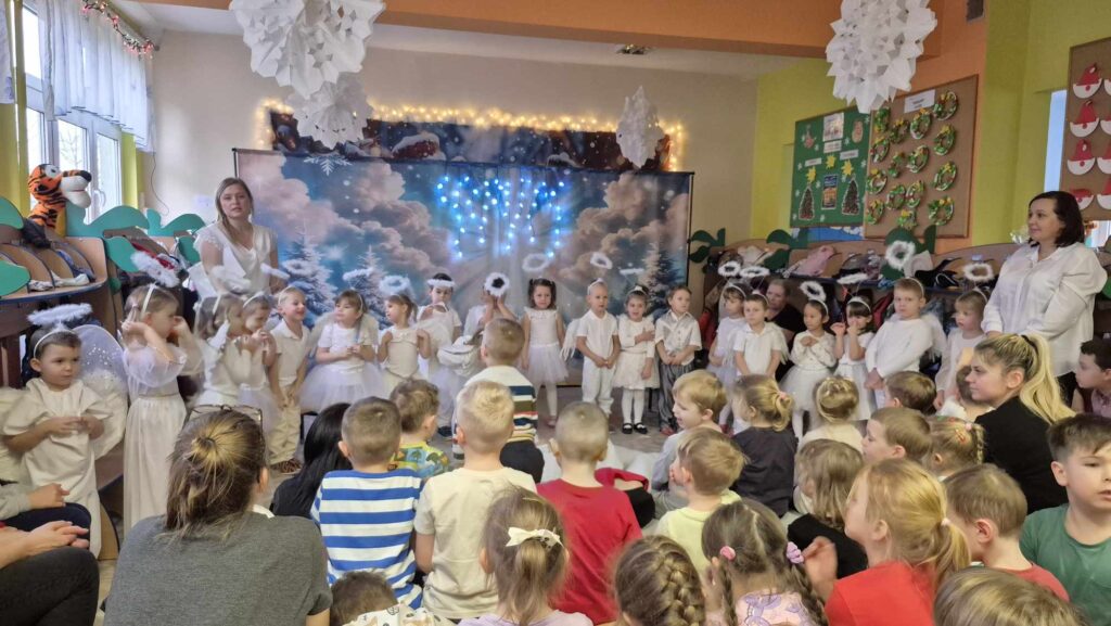 W świątecznej, pełnej ciepła atmosferze odbył się wyjątkowy koncert kolęd i piosenek świątecznych w wykonaniu 4-latków z grupy „Tygryski”. Dzieci z ogromnym zaangażowaniem i radością zaprezentowały przygotowany program artystyczny, wprowadzając wszystkich obecnych w magiczny nastrój Świąt Bożego Narodzenia.Mali wykonawcy, ubrani w piękne anielskie stroje, śpiewali znane kolędy oraz wesołe piosenki świąteczne, które wzruszyły i zachwyciły publiczność. Ich występ był pełen uśmiechu, dziecięcej spontaniczności i szczerej radości ze wspólnego muzykowania.Koncert był doskonałą okazją do kultywowania tradycji bożonarodzeniowych oraz zaprezentowania talentów najmłodszych. Występ „Tygrysków” został nagrodzony gromkimi brawami i na długo pozostanie w pamięci wszystkich uczestników.